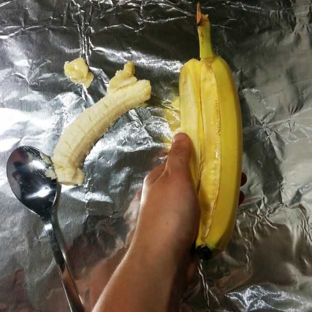 Con una cuchara, sacar un poco de plátano a lo largo de la longitud de la misma. No tienes que tomar fuera demasiado, lo suficiente como para hacer la banana en un poco de un recipiente. Especie de debe recordarle de una canoa en este punto (como en el nombre - Banana Boat).