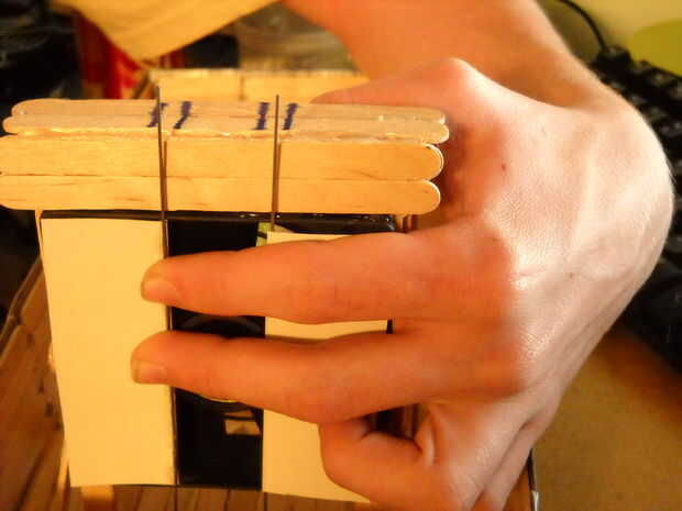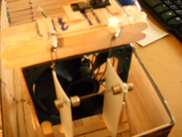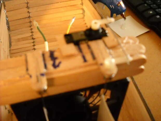 necesitarás palos de paletas, una pequeña barra de metel y una pieza de plástico.  esta parte es difícil de explicar así que mirar fotos para información