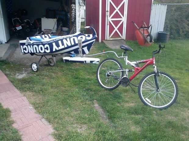 Antes de empezar a diseñar mis barcos para ser plegable, había construido éste de coroplast. Pesa alrededor de 10-15 libras y no encajaba bien en mi firebird 96. El lago que frecuentaba en mis filas mañana era cerca de 2 millas lejos de mí, y yo no iba a llevar la cosa en mi cabeza a través de la ciudad para llegar hasta allí. ¿La solución? Construir un remolque personalizado de mis fuentes de correo no deseados.