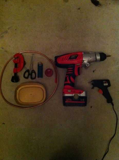 Tubo de cobre de pequeño, tijeras, encendedor, vela de té, pistola de pegamento caliente, cortatubos, un taladro y la parte inferior de un contenedor de hielo crema