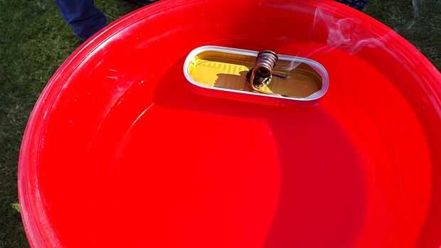 Ahora que el pegamento esté seco es momento de arrancar el motor de vapor. Se necesita la tapa de la botella, napking y aceite de cocina. Poner una parte del napking dentro de la tapa de la botella. Añadir unas gotas de aceite. Luego poner el barco en agua y con un encendedor, encender el napking con el aceite. El barco empezará a ir hacia delante después de 1 ó 2 minutos, si no Compruebe si el agua se calienta adecuadamente.
