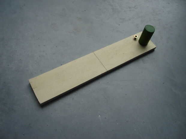 El tornillo corto y la forma del cilindro se colocan cerca de uno de los extremos de la pieza de madera. El espacio entre ambos debe ser igual al diametro del tubo de cobre o latón. La posición del tornillo a lo largo de la circunferencia del cilindro no es crítica. Sin embargo, si lo haces como en la segunda foto, podrás marcar la "posición inicial" para el doblez en el extremo largo de la pieza de la madera (ver última foto).