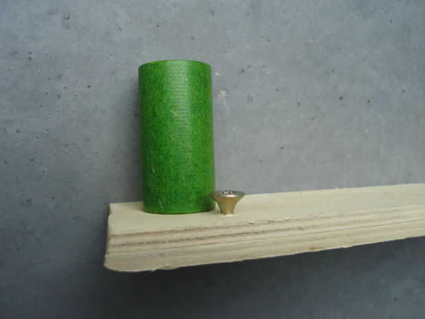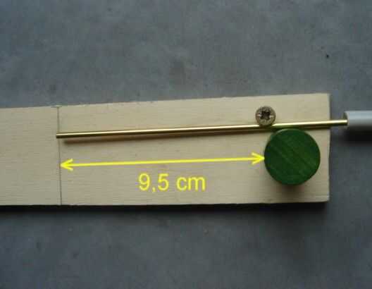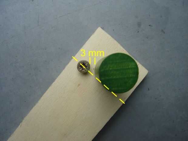 Encontrar la manera más fácil es poner en corto tornillo segundo primero y el cilindro. De esta manera es más fácil utilizar el tubo de 3mm para medir la brecha. También puede comprobar que la posición del tubo será paralela a la pieza de madera. Puede pegar el cilindro provisional y fíjelo firmemente con un tornillo largo de la parte posterior. Si su forma de cilindro es hueco puede adjuntar por verter pegamento caliente dentro. Puede Agregar un tornillo de la parte posterior, en la masa de pegamento, pero que probablemente no es necesario.