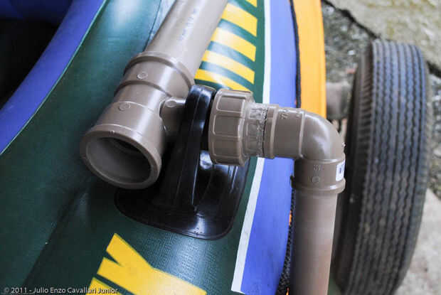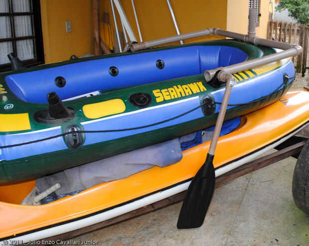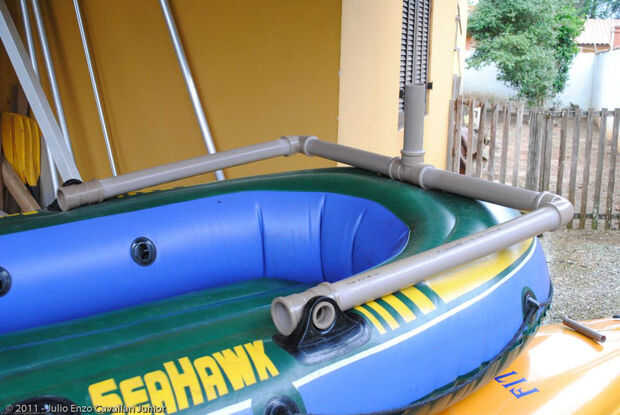 Como no se puede hacer un rasgón en el medio del barco para poner una orza, barcos inflables se utilizan en estas dos orzas laterales, utilicé las palas de pádel que tuve desde el momento en que quería hacer el bote a pedales, tuvo que tomar la curvatura de las palas, agua hervida y hundió la pala durante unos minutos en agua hirviendo , allí era solamente presionar la curva en vez de usar una toalla y utilizado tubo de PVC 32mm marrón, codos y uniones roscables, por lo que fácilmente puedo desmontar las bowlines y a la hora de navegar es solo apriete la tuerca y tack en posición. Nota que la distancia entre el mástil y las bowlines depende de la forma y el tamaño de la vela en la posición de las bowlines vela debe estar en el punto de mayor fuerza de vela, en mi caso coincidió con el apoyo del remo porque sería hacer vela.