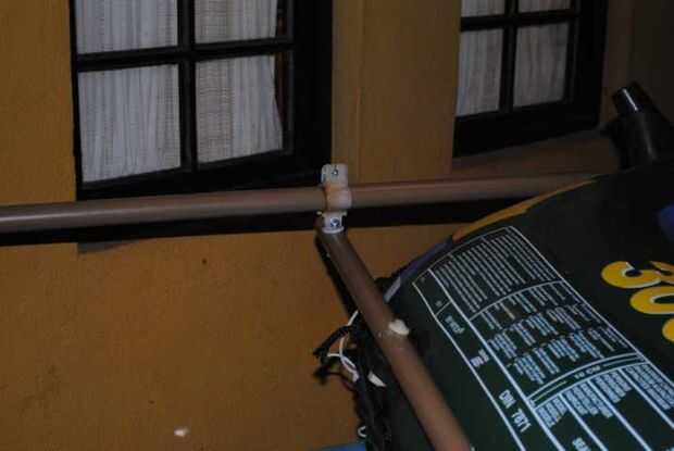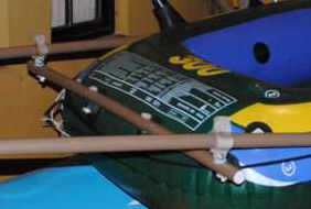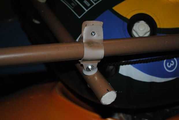 Las abrazaderas que hice con PVC, cortar 4 tiras de tubo de 40mm, calentado e hice doblar, luego pegado al pivote y configurar el cable para sujetar el timón / pádel.