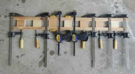 Trazado de líneas de lápiz en tiras largas para alinear los soportes. La idea es hacer una fila doble de calas que pueden rebanar hasta más tarde. Quería 1.25" a cada lado del pilar para el acabado grapa, así que cada enfrentamiento fue colocada aparte de 2.5". Colocar la madera para que no se pegar veta. Esto hará que el larguero de la Cala. Utilizar un montón de pinzas.