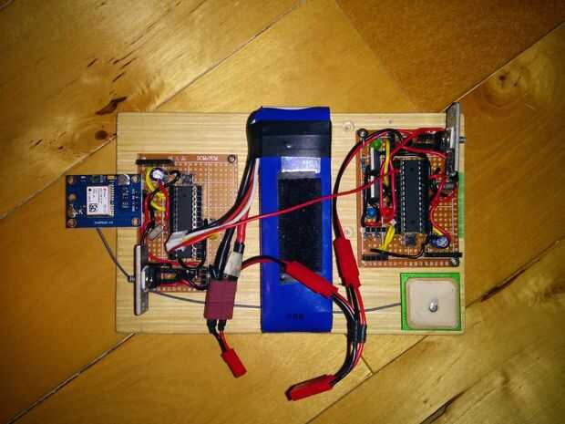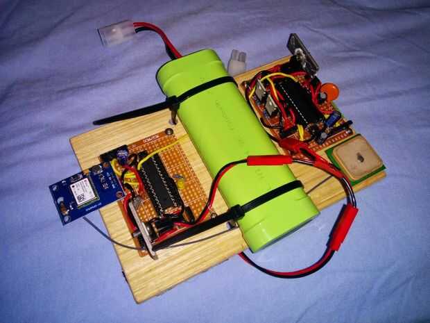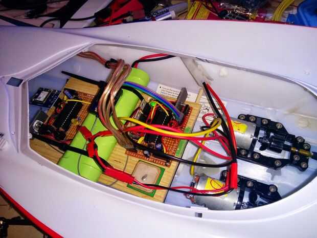 La antena GPS también Velcro tuvo a la Junta, y el receptor GPS simplemente se llevó a cabo por el jefe del perno en el perfboard. Para colocar el receptor RC al circuito, usé algunos Jerseyes de mujer pre-prensados, al que soldado algunos pins macho encabezado y asegurar con pegamento caliente. Los cables para los motores eran también soldados a un conector macho, aislados con pegamento caliente y conectados a la placa según el esquema.