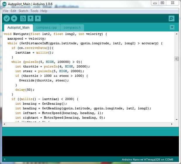 El segundo bosquejo tiene más responsabilidad. Toma la ubicación de GPS actual, calcula la distancia desde ese lugar hasta el siguiente waypoint, compara la partida hacia el siguiente waypoint con la brújula y controla los motores para ir allí. También es la función de anulación, que se detiene el piloto automático mientras que hay una señal desde el receptor RC. Entonces, esa señal se utiliza para calcular la velocidad de cada motor. Los waypoints que el piloto automático se programan directamente en este bosquejo.