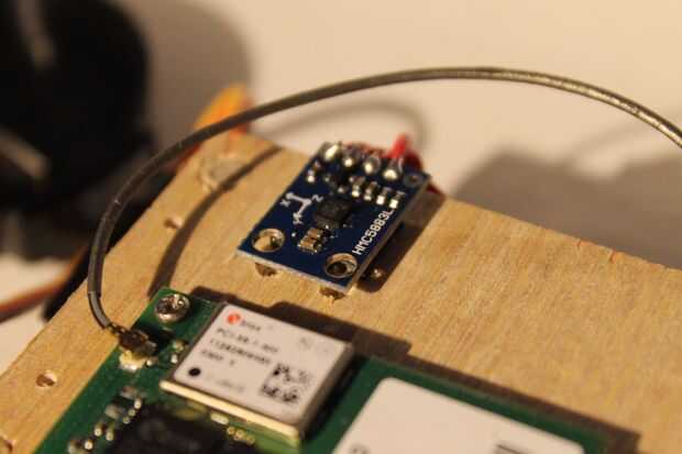 La brújula que utiliza es el HMC5883L, que conecta con el Arduino a través de I2C. Bildr tiene un muy buen tutorial sobre cómo conectar este compás con el Arduino. Para leer el cojinete usé esta biblioteca Arduino.
