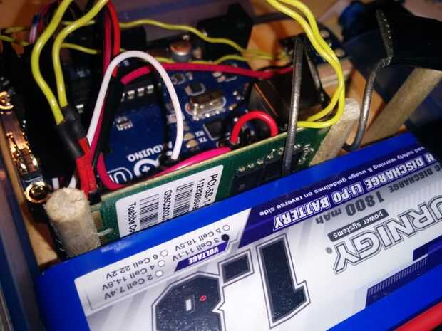 Adición de una batería para alimentar el Arduino era simple. Hay un pin de Vin en el Arduino Uno. Acepta hasta 20 voltios DC. Tuve un 12.6, 3 celulares, batería de litio poner alrededor, así que simplemente hice un conector que iban desde la batería hasta el pin Vin.