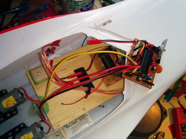 Siguiente orden del día fue garantizar el prototipo. Tengo un pedazo de madera, pegado en caliente un soporte horizontal (un pincho de bambú) cerca de los motores y velcro el pedazo de madera para el barco y el apoyo. El velcro tenía suficiente fuerza de retención para mantener el piloto automático asegurado, incluso al revés.