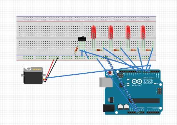 Conecte el sensor remoto, cables y resistencias a la protoboard y Arduino como se muestra en el diagrama de Fritzing adjunto a este paso. Deslice la otra mitad de la tapa de la caja sobre el protoboard y la instalación de Arduino. El rojo LED están en grupos de 4, cada miembro de un grupo paralelo con los otros y cada grupo se conecta a un pin del Arduino separado. En este bosquejo, los pasadores LED rojo en el Arduino son 6, 7, 8 y 9. Pin 5 opera el motor Servo y pin 4 opera el receptor remoto. Tenga en cuenta las resistencias de baja resistencia asociadas a las agrupaciones de LED rojo (simplemente estaba usando las resistencias de 220 ohmios en un kit que compré) y la resistencia más grande usado por el receptor remoto. Hay ningún valor exacto necesario para esta mayor resistencia, pero usé una resistencia de 1 kohm (220 era demasiado bajo).