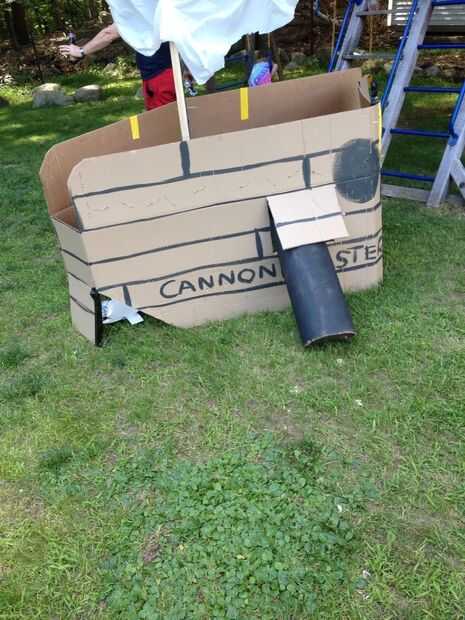 El cañón estaba hecho de sobras de 8" forma concreta, aerosol pintado de negro plano, he intentado hacerlo trabajo he añadido uno de ésos mano sostuvo pistolas de agua de tipo émbolo atado al extremo de un lado y grabados hasta encontrar la bola del cañón derecho fue mucho más difícil se necesita una bola de 5".