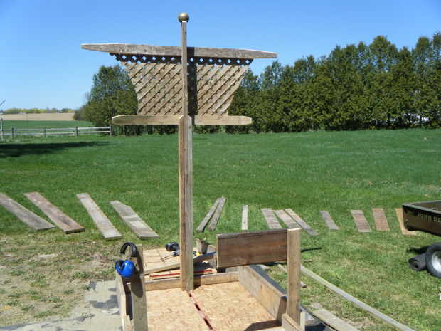 Para la vela que decidí usar algunos restos enrejado. Usé dos 2 x 4 con los extremos afeitado abajo como barras transversales y simplemente cortar el enrejado con una sierra de calar en una curva de una barra transversal a la siguiente. Una vez atornillada en el mástil principal parecía grande. Tuve que añadir extra 2 x 4 a ambos lados del mástil para evitar que si doblar una vez que la vela estaba en pero que acaba de hacer lo mejor. Como nota, la barra transversal más baja es solamente cerca de 5 pies de la cubierta por lo que me dio un par de tortazos a la cabeza como estaba trabajando alrededor de él. Lección aprendida es guardar la vela para el final. JAJAJA, Oh bien que se ve cool. En este punto os adjunto también el "salpicadero", no estoy seguro lo que llamar a él, pero la Junta que la dirección de la rueda se sujete a. El otro lado de esta tabla será fijado al mástil posterior más adelante, pero por ahora sólo está colgando en la brisa.