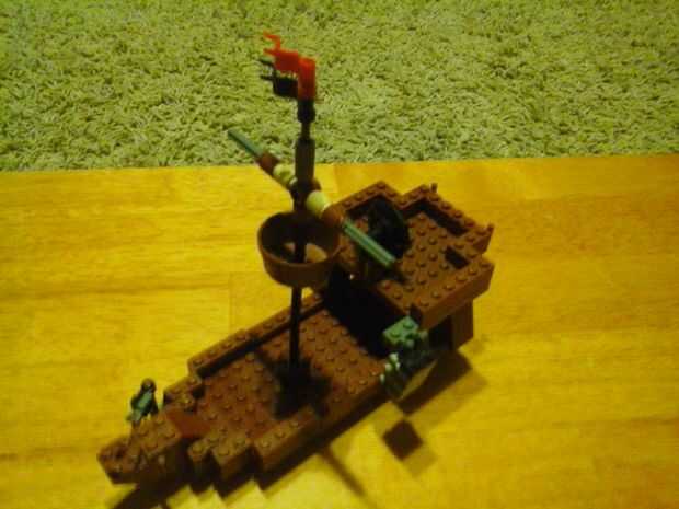 Aquí es mi esquife pirata de cielo con ventas móviles. Esto tomó aproximadamente una hora para llegar a y a partir de un grupo heterogéneo de las piezas que compramos de una tienda de caridad para nuestra hija.Aparte del barco de Lego City y unos ped