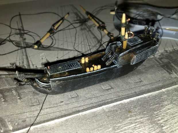 Tenga en cuenta lazos de alambre de cobre minúsculos donde pasaré estancias hilo de cada mástil.
