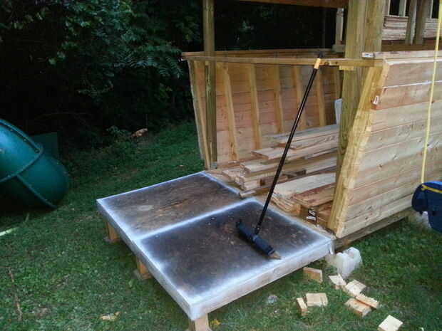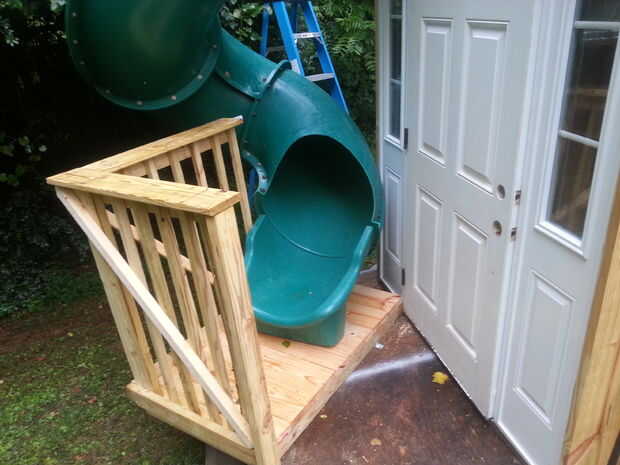 Después de colocar la diapositiva principal que descubrí que la bajada era alrededor de 1,5 pies desde el suelo, en este momento mis hijos son 4 y 2 años de edad. Después de algunas palabras de la elección y nombres intrigantes mi esposa me llamada, decidí remediar la situación con lo que llamé el "colector de cabrito". En sitio ocultado esto fue una gran idea, no pensé sobre ir abajo primera cabeza abajo la diapositiva y si pesa sólo 30 libras usted puede conseguir una velocidad. He añadido goma alfombras de impacto a la verja después de pruebas iniciales.