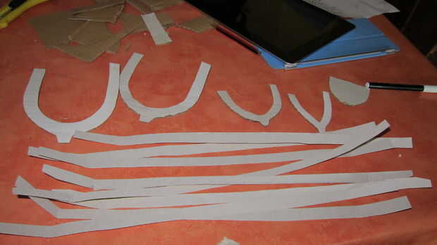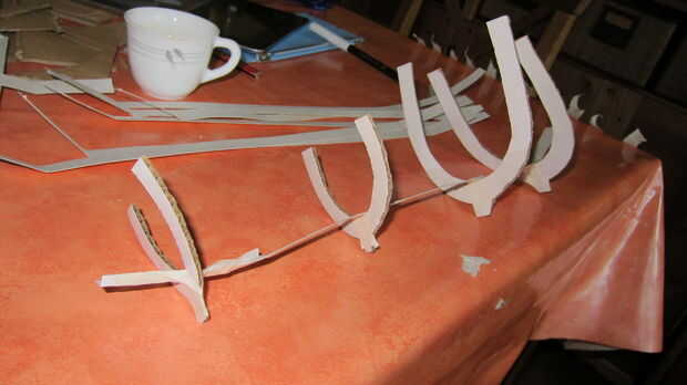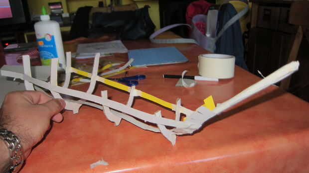 Cortamos algunas bandas de cartón suave y utilizamos tres o cuatro de ellos para construir el esqueleto de la nave.