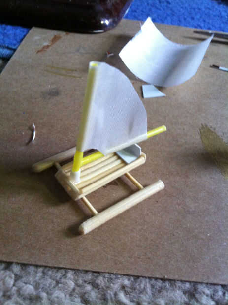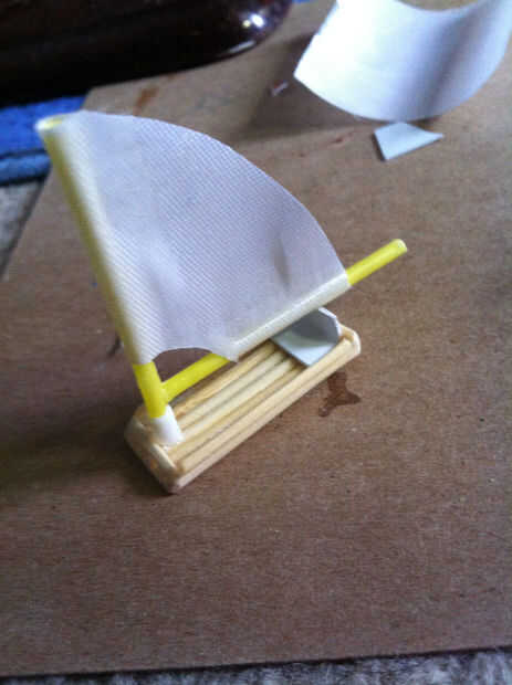 La vela se puede hacer de papel a tela que usé cinta de vendaje porque es fácil de doblar y encolar en su lugar. El paso final es pegar la cubierta a los soportes del pontón.