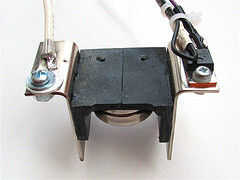 Para los electrodos separados de espacio correctamente y mantener en su lugar con respecto a los imanes, corté dos soportes de plástico negro de la otra parte de esa misma bandeja de papel. Pegado juntos para formar la forma de en forma de U invertida visible a la derecha. A este soporte, pegué dos imanes (1 pulgada de diámetro X 1/4 espesor, del mismo tipo utilizado para el barco de MHD de la bandeja de la espuma) y los dos electrodos.
