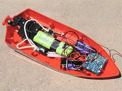 Aquí está el completo sistema MHD instalado y listo para ser sellado. La unidad de MHD se se sienta en el paquete de baterías NiMH verde. Puesto que ya no había espacio para la batería original 6-AA funcionar la radio y la dirección, en su lugar utiliza dos conjuntos de cuatro baterías AAA, morado en la foto. (Cada conjunto de cuatro da 4,8 V, un buen sustituto de 4,5 V de tres alcalinos).