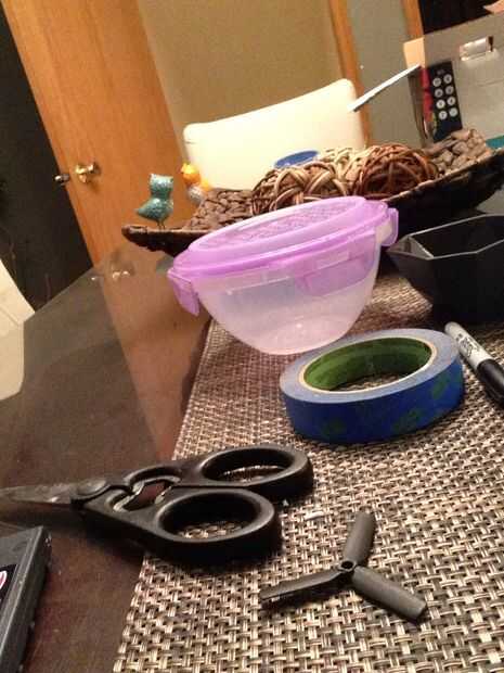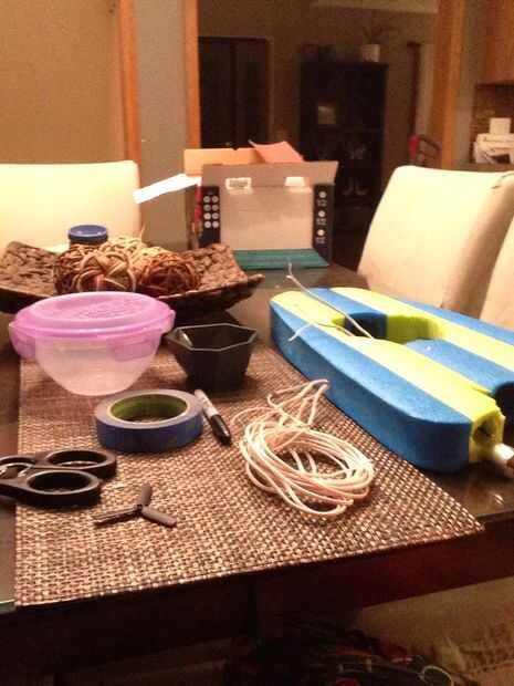 Reunir los suministros, flotante, plataforma, tijeras, cinta, alambre, marcador, 4 motores, 3 hélices, un apoyo de la dirección, un contenedor de prueba de agua, circuito de tablero de un viejo carro del rc y un refrigerio.