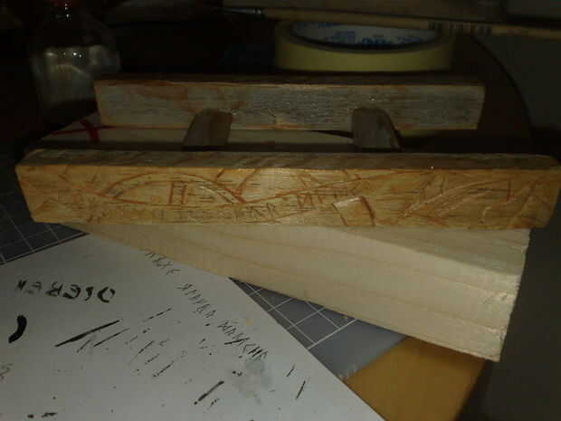 Porque la botella es redonda, necesito reposar. Tan pocas piezas de madera pegadas a I = a I forma, talladas algunas runas vikingas, barnizados y listo para pintura