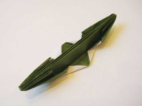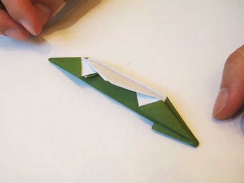 Ahora tienes un triángulo grande poco profundo a cada lado. Tomar el extremo superior de cada uno y dóblalo hacia el borde plano.
