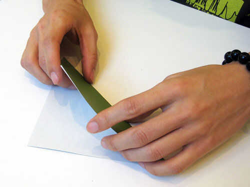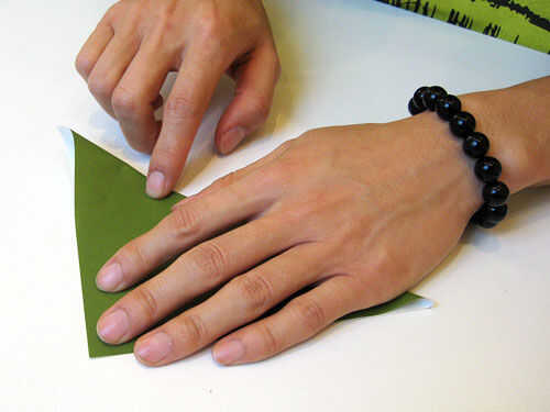 Coloque el lado de papel coloreado hacia abajo y doblar por la mitad para hacer un triángulo.