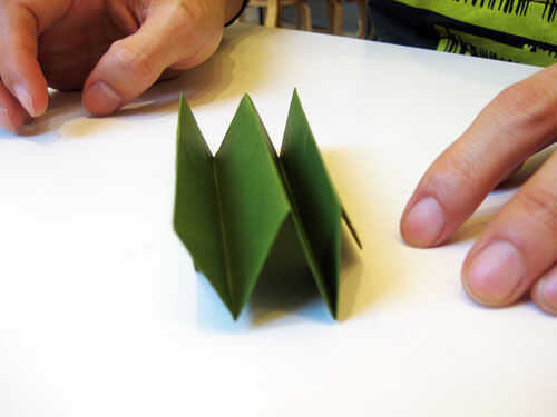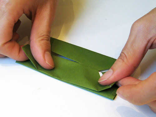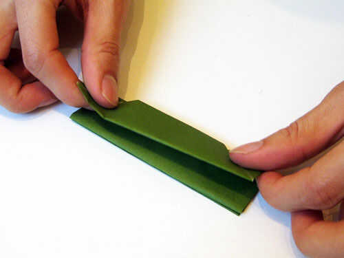 Doblar cada lado hacia atrás sobre sí mismo. Usted debe ser capaz de ver los bordes de los triángulos hechos antes de formar pequeños triángulos en las esquinas.