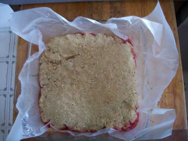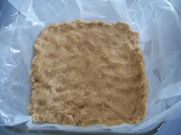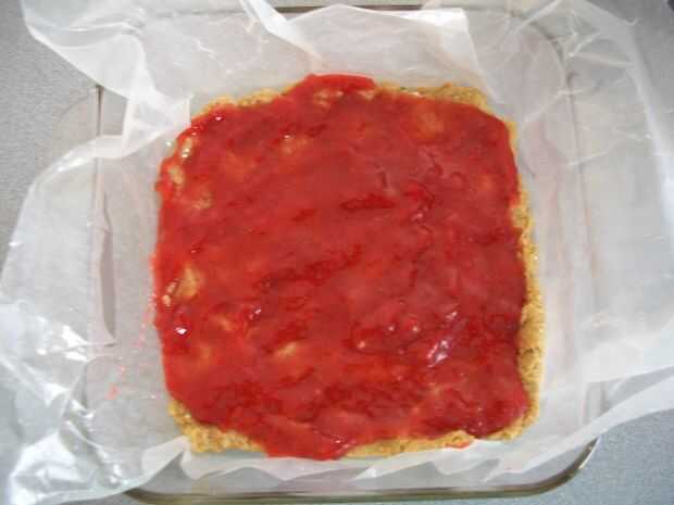 Paso 3: Línea un 8 pulgadas cuadrada para horno enmantecado con papel de cera. Papel de grasa otra vez y presionar una porción de la masa en la sartén. Extender la mermelada encima de la masa.