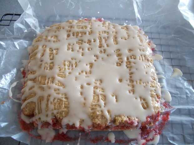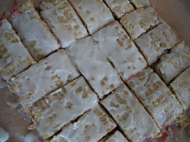 Paso 6: para hacer el glaseado combina todo esmalte ingredientes en un tazón pequeño hasta que esté suave. Sacar el esmalte con una cuchara y llovizna en la parte superior de las barras por. Dejar secar unos minutos antes de cortar.