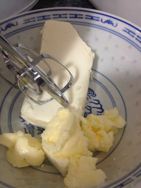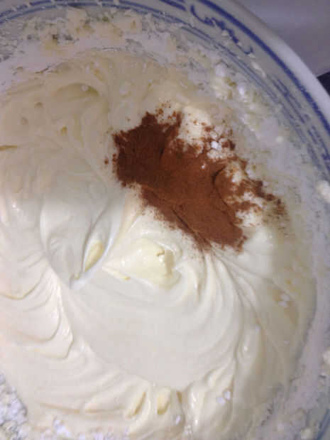 En un tazón separado, bata: 1 bloque de queso crema y 3 cucharadas de mantequilla hasta que esté suave, luego batir en 3/4 c glaseado de azúcar, 1/2 cucharadita de canela en polvo y 1 cucharadita de esencia de vainilla. Vierta refrigerado por chocolate y batir para combinar