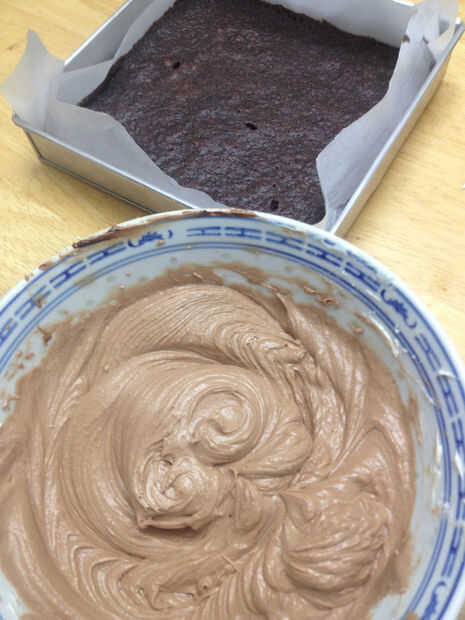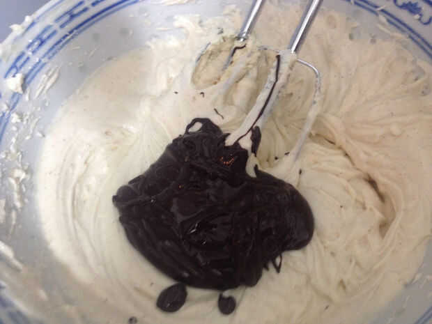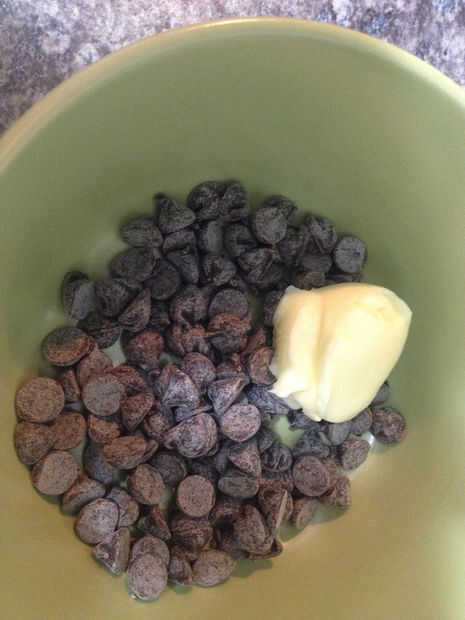 En un bol, derretir: 1/3 taza semi dulces chocolates con 1 cucharada de mantequilla o margarina (intervalo de 30 segundos en el microondas), dejar enfriar durante 10 minutos