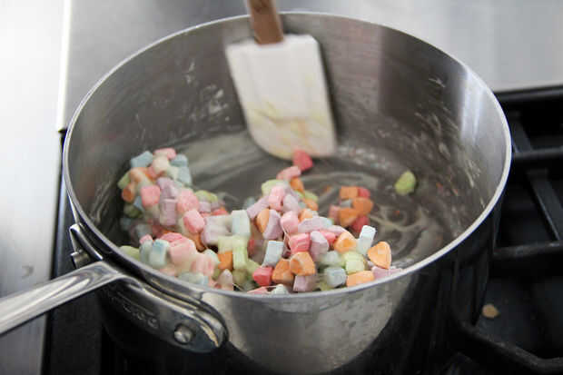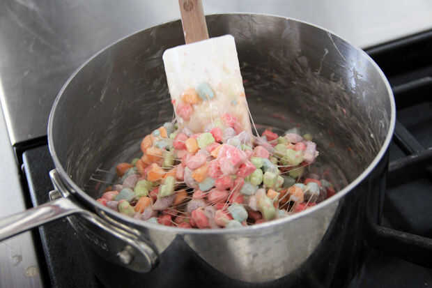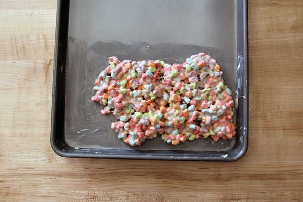 Cuando tu llano bombones y mantequilla se combinan y tienen una textura suave, quitar el calor y agregar tus bombones de cereal. Mezcle los rápidamente con la espátula hasta que los malvaviscos de cereales son uniformemente cubierto, pero no demasiado que los malvaviscos derretidos comienzan a disolver tus bombones de cereal! Es un arte. Cuando las melcochas de cereales están completamente cubiertas, Esparza la mezcla sobre la bandeja del horno con mantequilla o bandeja de cristal en forma rectangular aproximadamente de una pulgada de espesor. Será probablemente pegan bastante bien. La forma no importa demasiado ya que vas a cortar más tarde, pero es útil si tiene espesor relativamente uniforme.