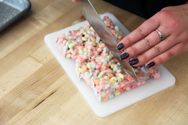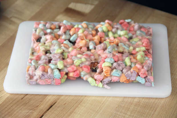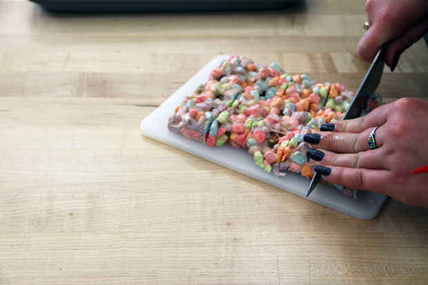 Corté este lote en un rectángulo porque los lados lindos miran realmente bastante con todos los colores diferentes de bombones de cereal. Corte el rectángulo en 15 pedazos que eran cuadradas aproximadamente 1,5 pulgadas. Estas cosas son tan dulce, que probablemente va a ser todo lo que quiero!