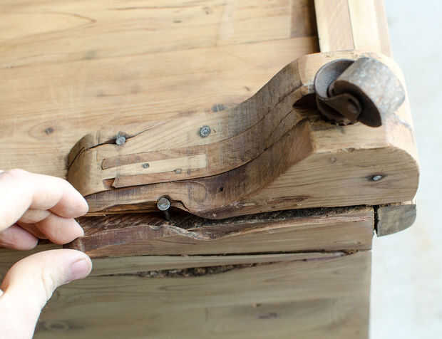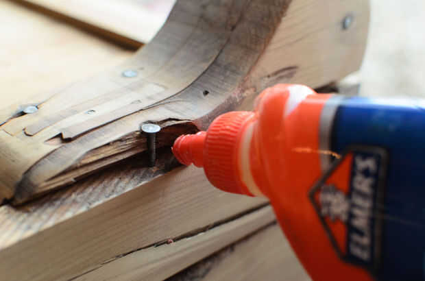Para correcciones cosméticas (como la astilla grande que había roto de la pierna en este pecho), pegamento de madera es grande. Es muy fuerte, especialmente si usted puede mantener el espacio entre piezas de madera tan delgada como sea posible. Aplicar el pegamento, utilice una abrazadera y limpie el exceso de pegamento antes de permitir que se seque. Después de 24 horas, tendrás un enlace muy fuerte. Se puede lijar ligeramente la zona para eliminar el exceso de pegamento y traer todo al ras.