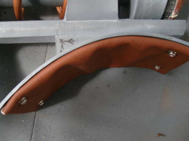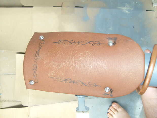 tengo el libro de arte, la guía del juego y el juego sí mismo. Encontré todas las fuentes de tres interesantes pero todos tenían diferencias. Los colores parecen diferentes entre las tres fuentes. Incluso en el juego de la iluminación muestra muchos matices diferentes. Esto es particularmente evidente en la parte superior delantera de la pistola. En el libro de arte aparece rojo. En el juego aparece un poco como cobre o marrón oscuro. ¿Hacerlo en una hoja de cobre o con un paño marrón? Mi mente Ingeniería en. Si se trataba de una pistola de verdad quiero que tenga una tapa de cobre actúa como un disipador de calor y calor lejos del cañón o un pedazo de cuero para actuar como un protector de calor y proteger el jugador. Permite al usuario mover esta pieza sin quemarse a ellos mismos. Fui con este último. Sería costoso y difícil de utilizar 1/4 '' cuero grueso. Para trabajar alrededor de esto me fui a mi tienda local de tela y arte. Elegir un 1/4 '' pedazo de espuma y corte a tamaño entonces lo envolvió con un cuero como tela. Siento que este método era una más fácil y más barato para trabajar. Hice algunas plantillas básicas a la tela para simular el grabado de cobre. Las piezas "leathe '' fueron Unidas utilizando tornillos largos de 1/4' y arandelas de acabado.