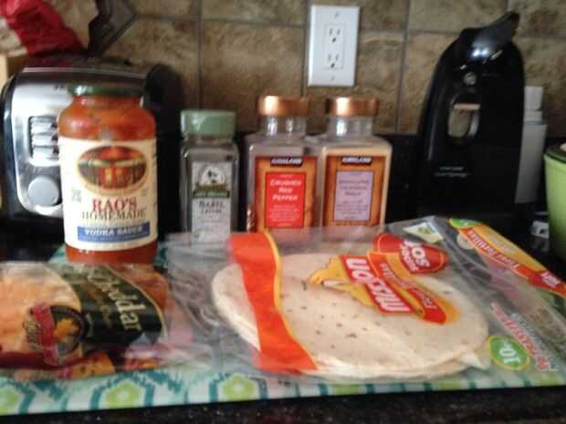Paso 1: El comienzo Tomar dos bases de tortilla y ponlos en un plato grande. Y añadir un poco de queso en el medio de esas bases, te sugiero en los lados.Paso 2: La salsa de tomate. Tomar un tazón de fuente. Tomar algunos fulls de cuchara de salsa de