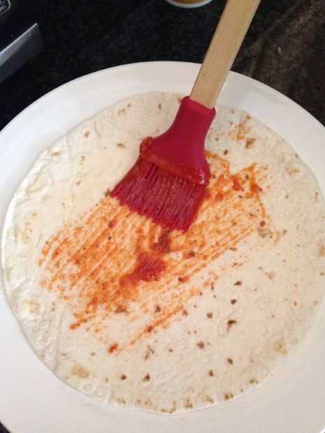 Vierta aceite de oliva en un tazón y cepillo en la tortilla. Hacer lo mismo con la cantidad deseada de salsa de tomate.