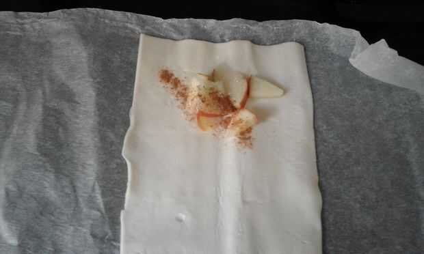 Coloque los pedazos de manzana en un lado de la hoja de hojaldre.