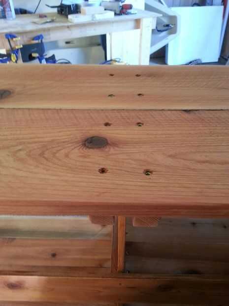 Fije la tapa con 2 tornillos por placa por apoyo. (ver foto) Ahora siéntese detrás tienen una bebida y admirar tu trabajo. La construcción se hace! Todo lo que queda... lijado y acabado.