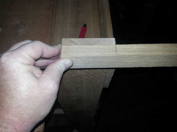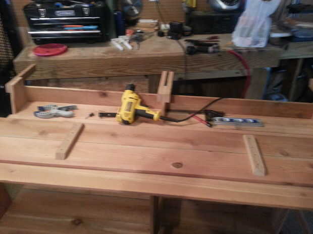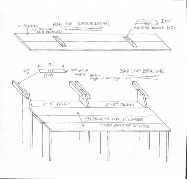 Ahora la barra superior de sí mismo. Cortar sólo el oído del perro como se muestra en la imagen luego 1 tablero más la longitud exacta de la misma. Ahora cortar 2 bloques de reparación como antes excepto que esta vez que el lado largo de 1 x 2 es 9 1/2". Coloque las dos barras principales barras juntos incluso en los extremos y tratarlo de la misma forma que hiciste las mejores tablas de contador. Los ponen al lado del otro y asegurarse de que permanecen firmemente juntos toda la longitud y están en las inmediaciones del mismo grosor. Una vez que están a su línea de gusto los extremos de la barra superior de tableros y globo ocular 1/2 camino entre piernas (misma área como el estante de reparación bloques) y coloque los bloques de reparación como se muestra en la figura (Recuerde que es la parte inferior de la barra de inicio si desea que un particular hacia arriba Asegúrese de que no este lado). Usé 2 tornillos del bloque en cada tablero superior de la barra.