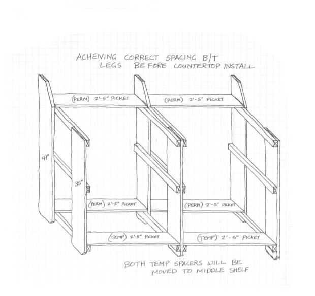 OK ahora tenemos nuestros ensambles de las patas y nuestros espaciadores / tableros de mostrador y anaquel. Como se puede ver 4 de ellas 2' - 5" son para el estante del medio, 2 son la parte trasera del contador entre la barra de las piernas y 2 son para la misma ubicación en el estante inferior. Puede utilizar las otras tarjetas de estante intermedio para espaciadores ahora como temporales en el frente del estante inferior (se trata de un tablero completo con una muesca cortada para la pierna de centro pero para ahora los espaciadores Asegúrese de que todo es cuadrado)