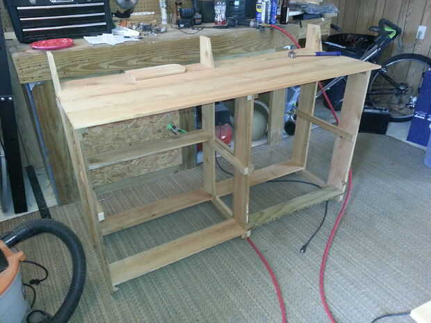 Ahora tenemos algo que está empezando a pararse en su sobre. Repetir el mismo proceso para las juntas entre la barra de las piernas sobre los tacos del estante inferior.