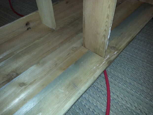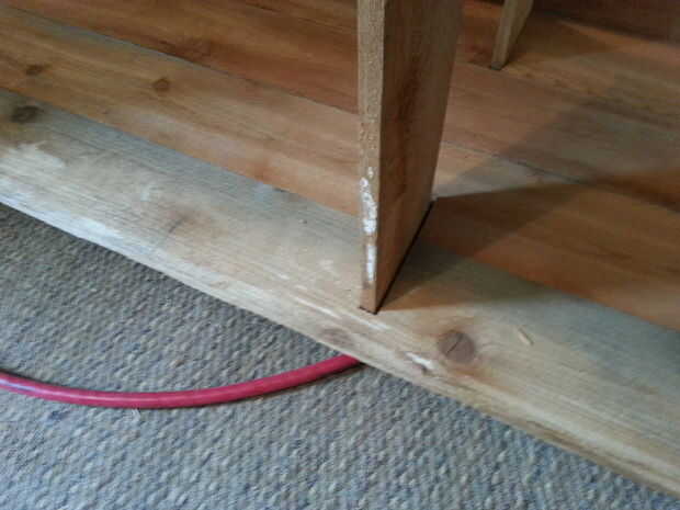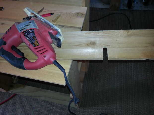 Ahora repita este proceso para el tablero del estante inferior delantera. Será más fácil seguir la misma ruta de localización de la pata de contador central en este tablero colocando encima de las tablas que acaba de instalar y marcar los laterales de la pierna en esta mesa final. La única diferencia es este tiempo se mide desde el borde delantero de la última tabla que instala en el borde delantero de la pierna contraria. Ahora hacer la medida en que (aquí es donde es diferente) desde el mismo lado de la nueva junta la pierna las marcas están en. Última vez que tiró de la medición de las marcas de la pierna opuesta. Dibujar su muesca y corte hacia fuera. Ahora Revise esta tabla igual a la última e instalar.