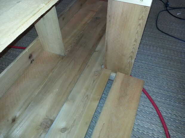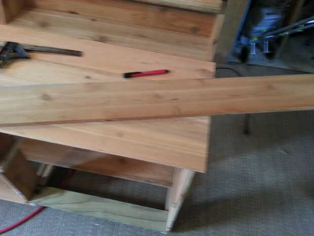 Ahora toma uno de los tableros y adjuntarlo al ras con la parte exterior de las calas y apretado contra las tablas previamente instalada 2' - 5" entre la barra de las piernas. Ahora que esta placa se une puede quitar a los separadores en la parte delantera del estante inferior.