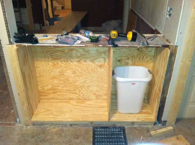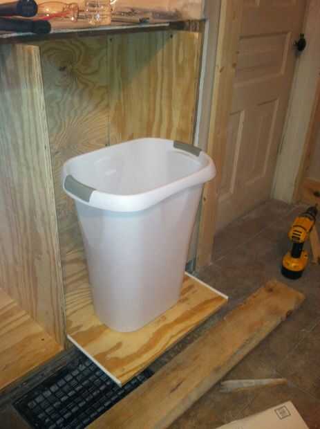 Encontramos un bote de basura que encajaría muy bien y estaba listo para comenzar a diseñar los cajones y para un bote de basura deslizante. Menards tenía un kit pero basado en el tamaño y espacio que tuvimos que trabajar con él era más barato hacer bricolaje.