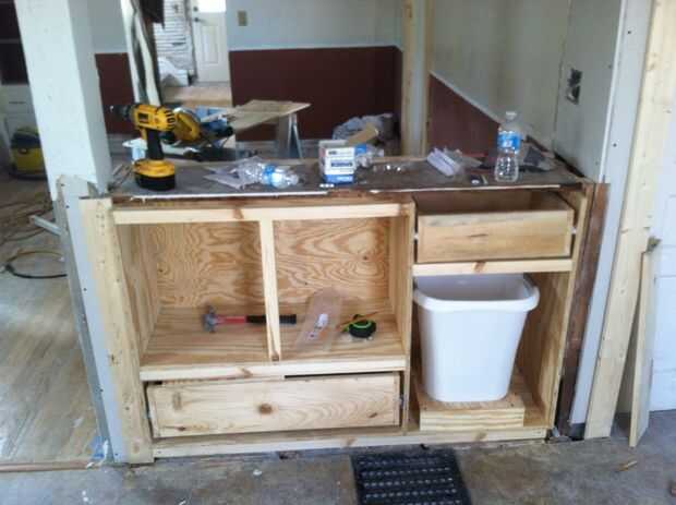 Construí otro cajón con pino para caber el espacio tuve utilizando madera contrachapada para la parte inferior y esta vez utiliza diapositivas del cajón de 30 libras de peso ligero tal vez. Por el espacio sobre el comedero del perro puse un 2 x 2 en el centro que proporcione una tarjeta para puertas de gabinete en. Dejándola abierta para máximo espacio. El marco fue hecho y estaba dispuesto a trabajar en la parte superior, que estaba más emocionado.