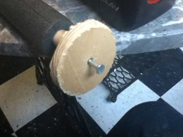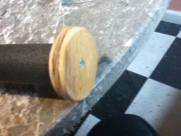 3. cortar 2 1/2" diámetro 1/2" madera contrachapada gruesa tapones. El diámetro no es realmente importante. Lo que importa es que las tapas son al menos 1" más grande que el aislamiento de la pipa para mantener la cometa manijas resbale.